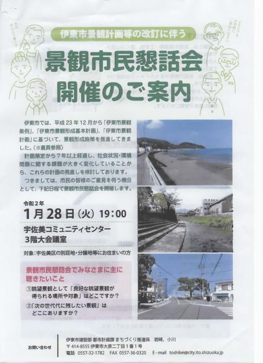 December 30, 2019 5:35 pm | 自治会、連絡事項 | shiranamidai | 0景観計画<回覧板添付資料>伊東市景観計画等の改訂に係る市民懇話会の開催について(お知らせ)-伊東市都市計画課 2019-12-17<参考>伊東市景観計画