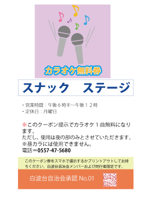 January 20, 2020 12:11 pm | クーポン、自治会 | shiranamidai | 0クーポン券スナック ステージカラオケ無料券このページをスマホに表示させてお店に提示するか、プリントアウトしてお店に渡してください。カラオケ無料券スナック ステージ・営業時間:午後6時半~午後12時・定休日:月曜日電話=0557-47-5680住所=宇佐美・スーパーナガヤの前 左のクーポン券をスマホで提示するかプリントアウトしてお持ちください。白波台自治会メンバーおよび同行者限定です。<自治会からひと言>気軽に飲めて歌えるスナックです。 ・営業時間:午後6時半~午後12時・定休日:月曜日電話=0557-47-5680住所=宇佐美・スーパーナガヤの前